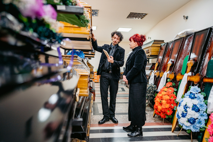 They meet with family members or friends of the deceased to plan the funeral or memorial service, help with writing an obituary, and provide information about cremation and burial options. Funeral directors and morticians also typically maintain a casket room to show available options, and help to plan details of the service such as arranging for clergy to provide services and transportation for mourners. They also coordinate burial arrangements with cemetery staff.